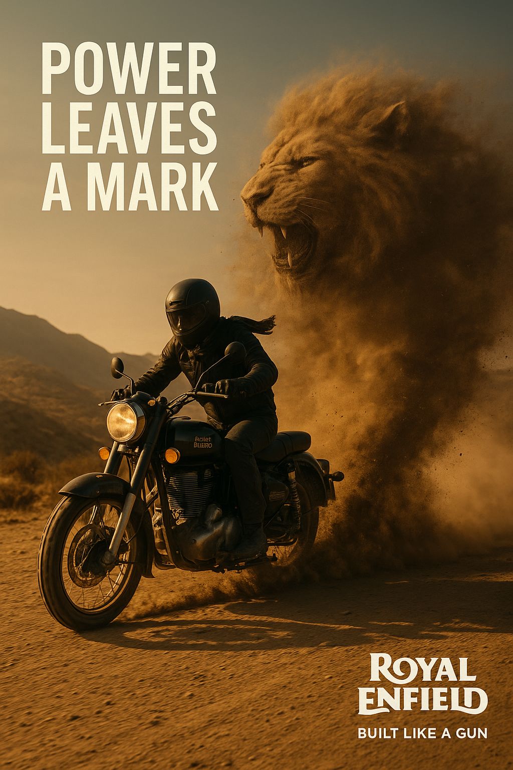 Symbolic alignment: Royal Enfieldâs legacy of grit and muscle is visualized through natureâs king â the lion. A bold, masculine, visceral image that needs no further explanation.